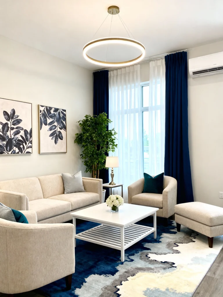 Wow, talk about fresh and chic! This room is a masterclass in modern sophistication. The crisp white walls and sheer curtains keep the space feeling open and airy, while those stunning navy blue drapes and the abstract blue rug anchor the entire design. The velvet throw pillows on the neutral beige seating add a little pop of jewel-toned color and texture—it’s all about those small details! And can we talk about that circular gold chandelier? It’s the perfect contemporary statement piece. This is the kind of clean, vibrant room that just makes you feel instantly calm and stylish.
