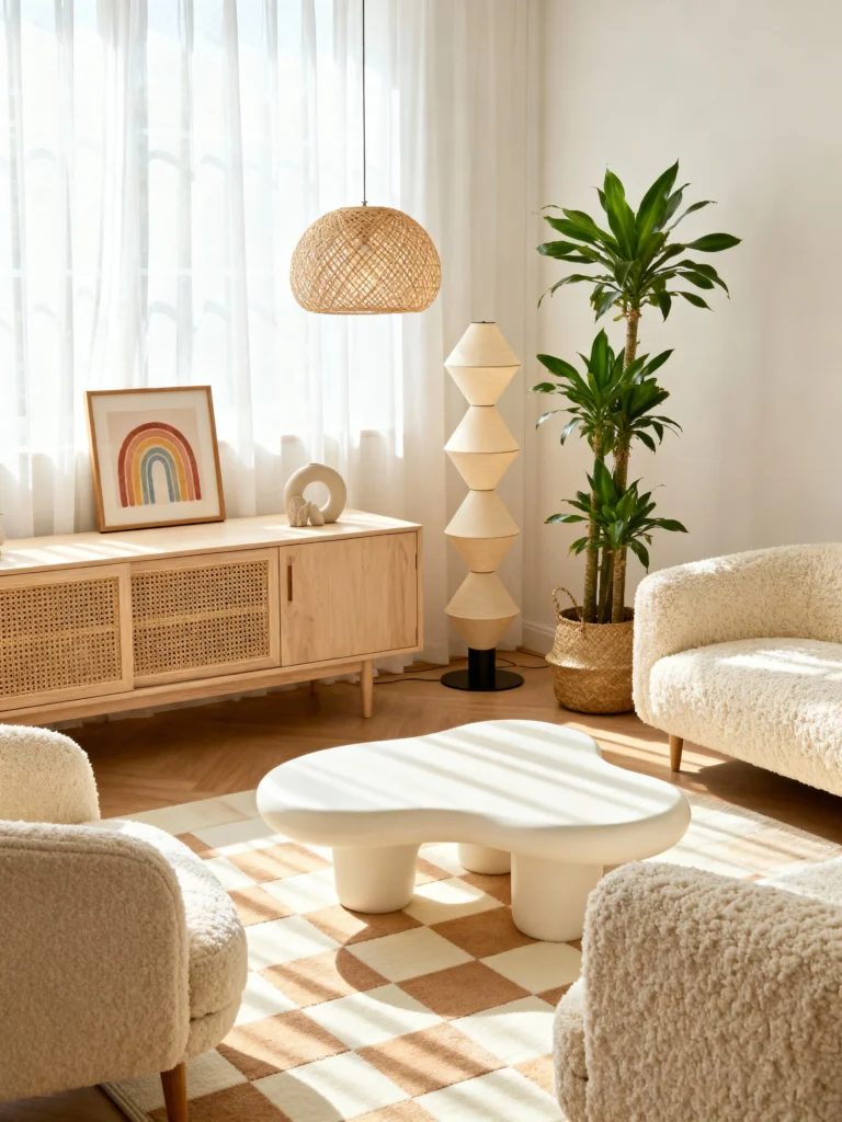 How gorgeous is this light and airy look? I’m obsessed with the mix of textures here—the wicker pendant, the natural wood cabinet with cane detailing, and those super cozy, fluffy armchairs! But the real star is that cloud-like coffee table and the totem-style floor lamp. It feels effortlessly chic, especially with the geometric rug tying in the natural color palette. Plus, the pops of green from the huge plant? Instant mood boost.