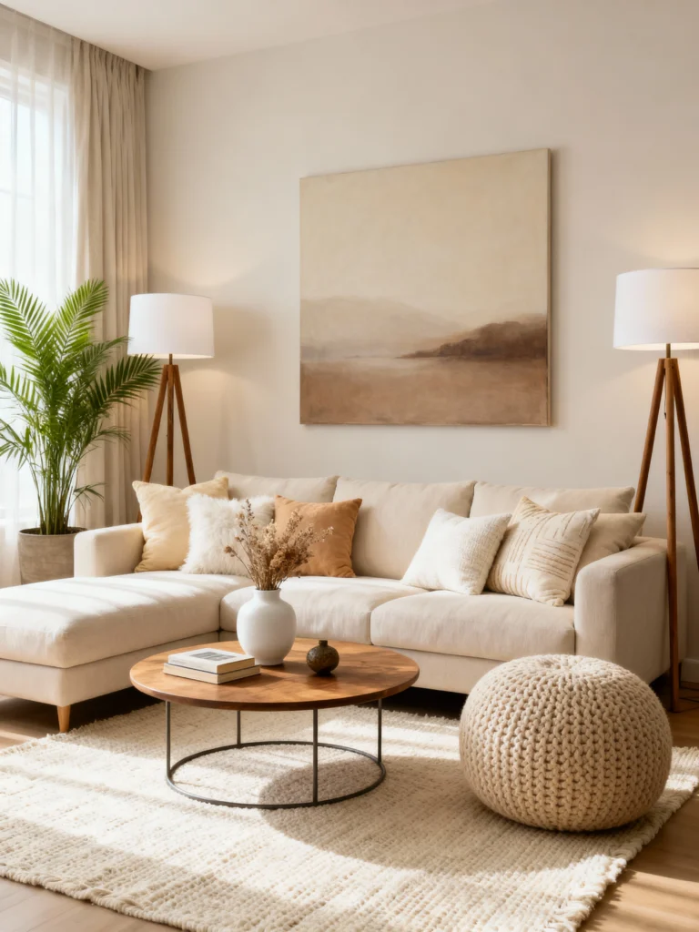 This space is the definition of cozy neutrals! The large sectional is drowning in pillows of various creams and tans, begging you to sink in. The floor lamps with the wooden tripod bases add height and a warm, rustic element. I love the chunky knit pouf and the woven rug, which add depth and softness. The gentle, abstract landscape painting completes the look, making it feel calm and incredibly relaxing.