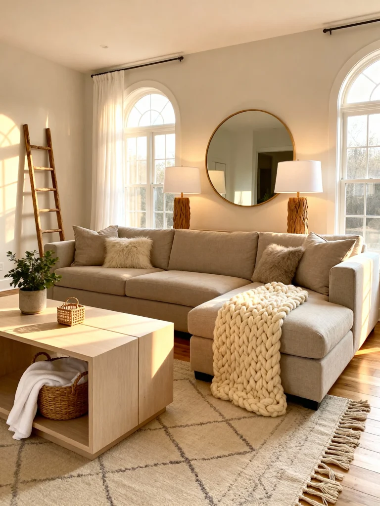 If you need a dose of sunshine, this room is it. The massive, comfy-looking sofa with the chaise lounge is perfect for afternoon naps. The simple light wood coffee table is super practical with its open storage. I adore the chunky knit throw and the natural wood ladder leaning against the wall—it adds a cool, architectural element.
