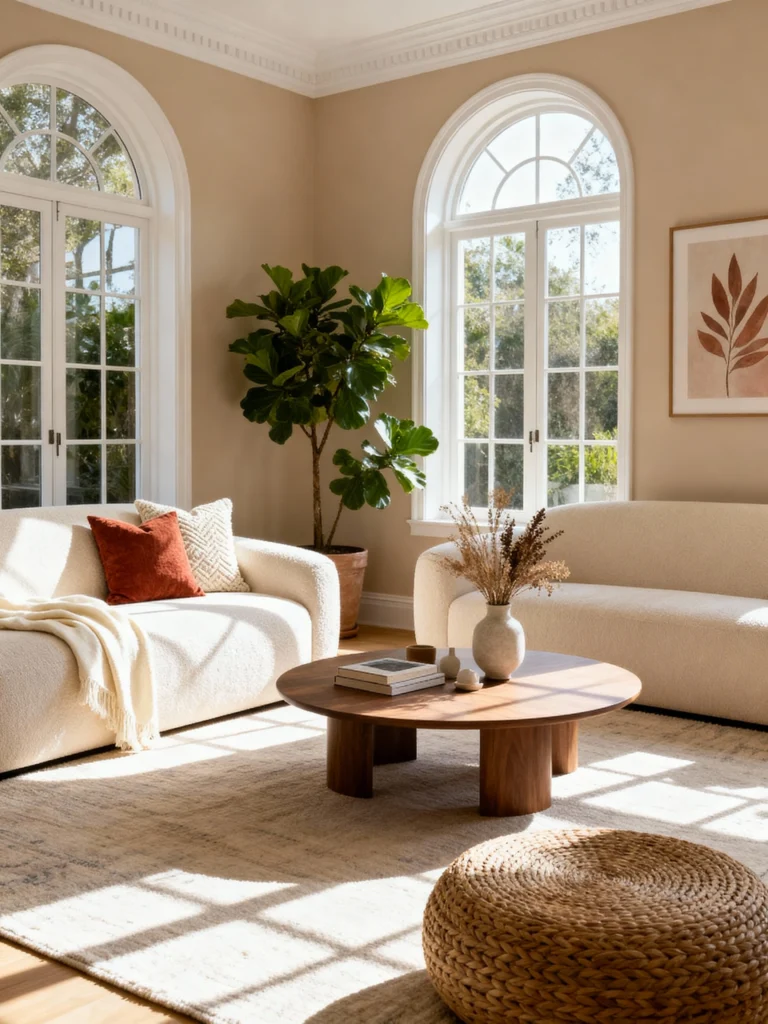Can we talk about these windows?! The arched frames are stunning and flood the room with natural light, perfect for that massive fiddle-leaf fig tree. This space keeps the palette soothing with soft beige walls and cream-colored, curved sofas. The dark wood coffee table provides a solid anchor, while the chunky woven pouf and layered natural textures keep it grounded and super inviting. It’s elegant and sun-drenched!