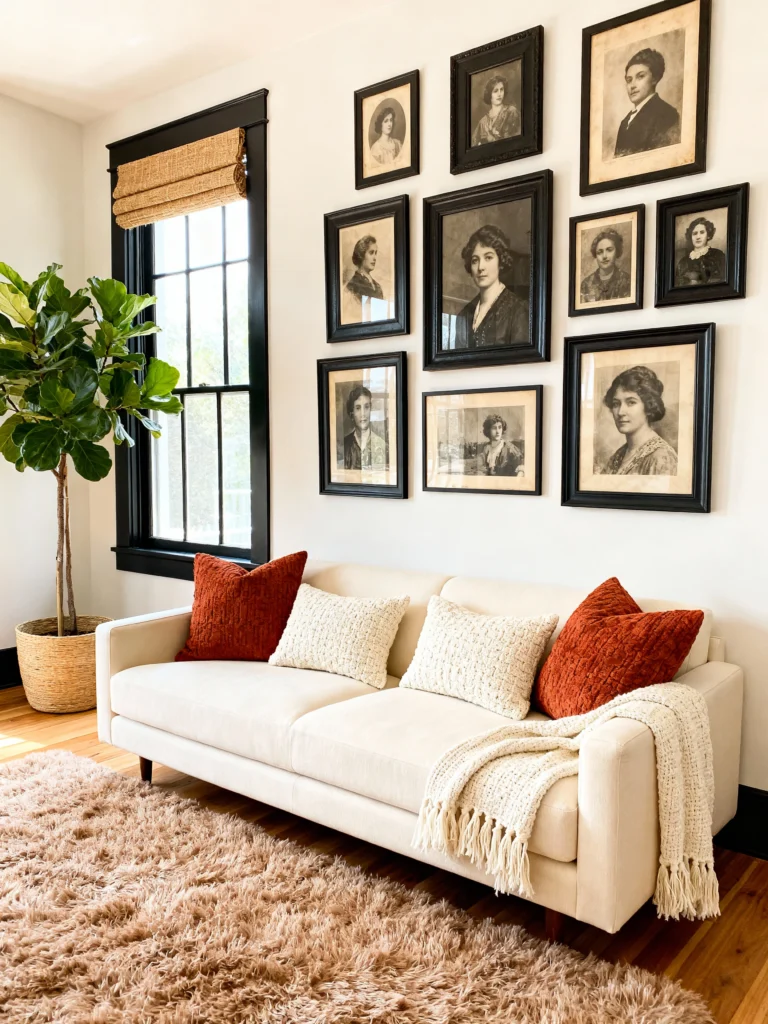 This look proves that a high-contrast palette can still be cozy. The crisp white walls and sofa are dramatically framed by black window trim and a stunning gallery wall of vintage-style portraits in black frames. The texture comes in strong with the furry, rust-colored pillows and that thick, shaggy, blush-toned rug. It feels deeply personal and a little dramatic in the best way!