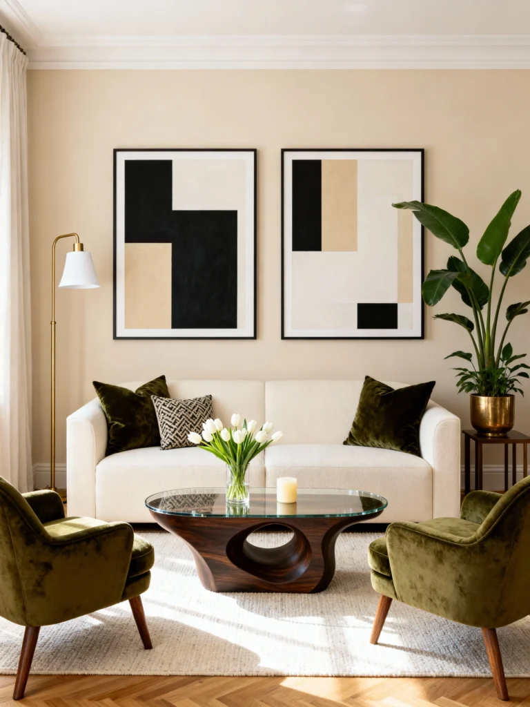 This room is giving me serious luxe vibes! The clean, minimalist abstract artwork in black and beige provides a cool backdrop for the rich texture of those deep olive-green velvet armchairs. The white sofa and simple rug keep the space balanced. But seriously, that coffee table with the dark, organic wood shape is a work of art all by itself! It’s sophisticated, stylish, and perfect for cozy evening chats.