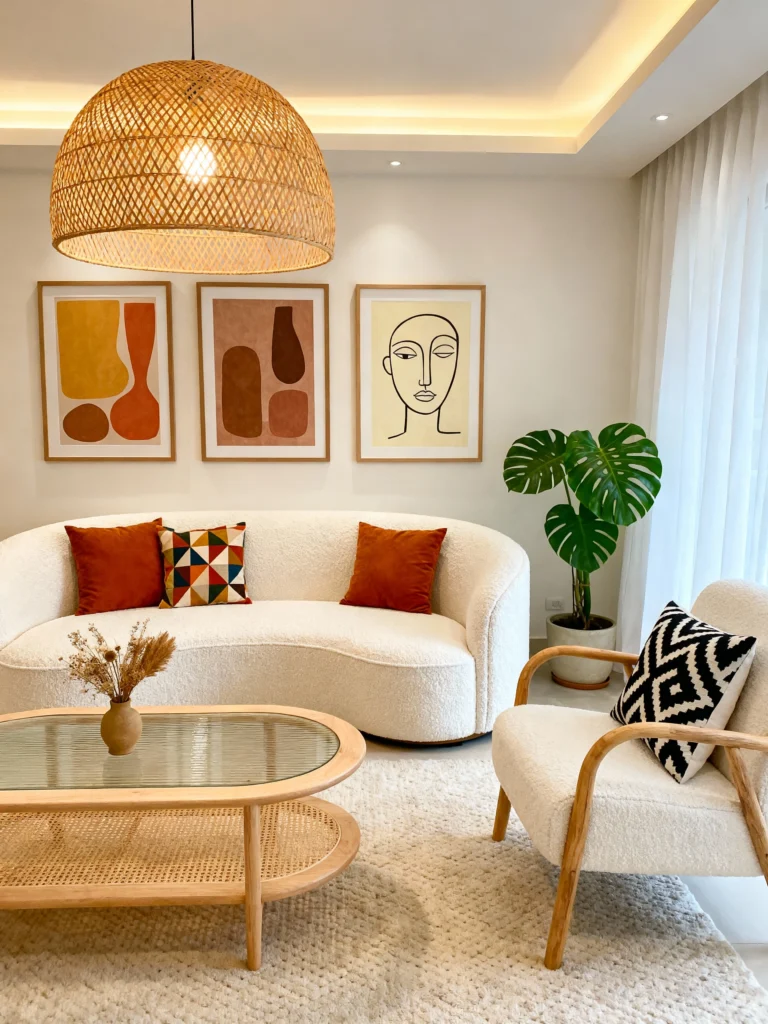 This room is a lesson in mixing shapes! You have the rounded, bouclé sofa paired with an oval glass-and-cane coffee table. The massive rattan light fixture adds a cool, organic focal point. I love how the abstract wall art picks up the rust and ochre tones in the velvet throw pillows, giving the whole room a vibrant, yet grounded, energy. The single Monstera plant seals the deal for that touch of modern jungle charm.