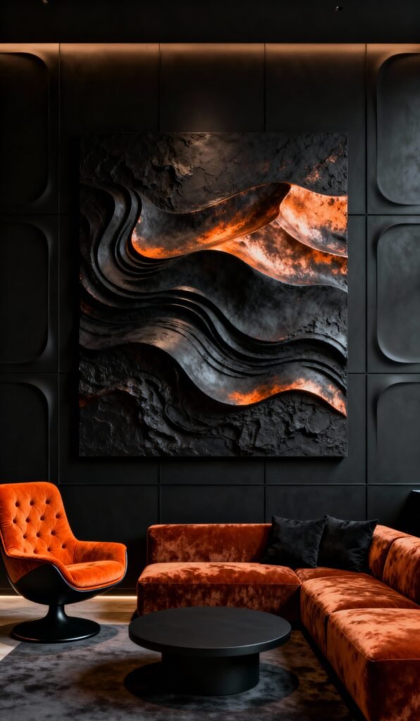 This is next-level texture. The black paneling provides the perfect backdrop for that monumental, abstract artwork with its stunning orange, molten-lava accents. And the furniture? Hello, velvet! The burnt orange lounge chair and sectional sofa are so rich and inviting. This room is a masterclass in using light and shadow to create a deeply luxurious and sophisticated atmosphere. It feels like a high-end gallery space—I absolutely love it!