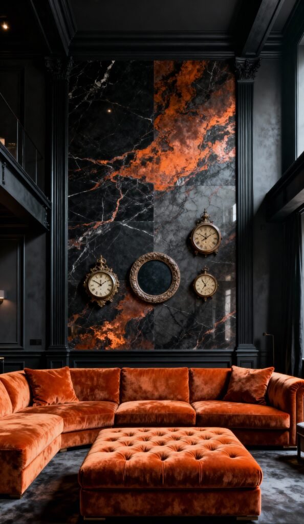 The star of this show is undoubtedly that towering marble feature wall. The black marble with the veins of fiery orange creates a stunning, natural, and dramatic backdrop for the room. The oversized, tufted orange velvet sectional and ottoman practically glow against the dark walls. The vintage clocks and round mirror add a classic, almost eccentric touch to this grand and luxurious space. It’s bold, beautiful, and absolutely unforgettable!
