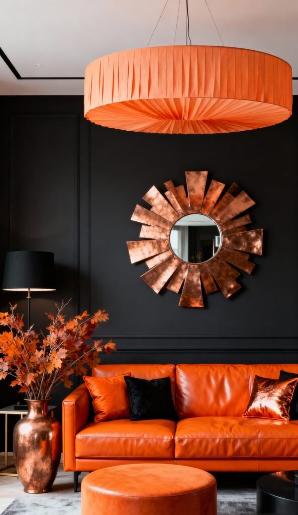 The orange leather sofa is undeniably cool, but the accessories are the real showstoppers. That huge, pleated orange pendant light instantly draws your eye up, and the copper sunburst mirror is just spectacular—it warms up the black wall beautifully. The metallic accents, like the vase full of orange foliage and the shimmery throw pillow, add a touch of fall luxury and high-end polish. It’s a chic and moody take on the classic color pairing!