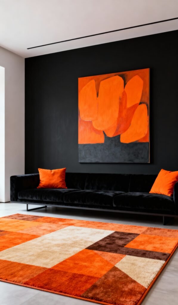If you’re into clean lines and modern art, this is your inspiration! The simplicity is key here: a smooth black wall, a streamlined black sofa, and two pops of orange in the throw pillows. But the real star is the floor! That large, graphic rug with its stunning mix of oranges, browns, and creams provides all the visual interest and energy the room needs. It keeps the space feeling warm and expansive without being cluttered. It’s a perfect example of modern minimalism with a warm twist.