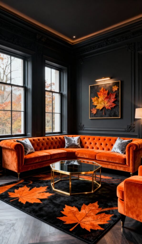 Doesn’t this room just exude old-world charm? The deep, tufted orange velvet sectional is the definition of luxury—I want to sink right into it! The black walls and detailed moldings give it a classic, moody library feel. And check out that rug! The black background with oversized orange maple leaves brings in a gorgeous, seasonal touch and complements the artwork above the sofa perfectly. The gold-framed coffee table adds just the right amount of metallic shine. Truly magnificent!