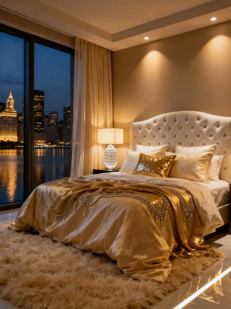 This room is pure sophistication and glamour. The tufted headboard, the soft beige walls, and the high-shine marble floor set a sleek stage, but the real star is the gold—everywhere! From the plush velvet throw draped with pearls to the sequined accent pillow, it’s all about luxurious texture and sparkle. And that floor-to-ceiling window showcasing the city lights and waterfront? It makes you feel like you’re sleeping in a private, glittering observatory.