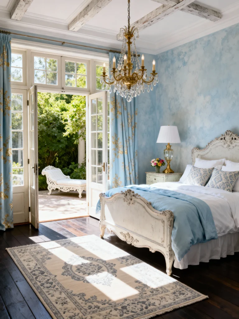 This room just takes me straight to a sunny European garden. The pale blue, almost cloud-like wall texture is so soothing, and that distressed white French-style bed frame is pure elegance. I adore the double doors opening up to the lush greenery—it makes the room feel so open and fresh. The floral curtains and classic gold chandelier complete the timeless, relaxed vibe. It’s like waking up in a countryside villa every single day!