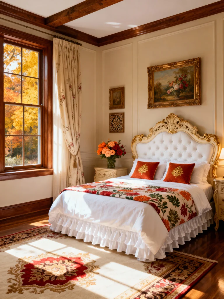 Talk about bringing the outside in! The rich, warm colors of the autumn foliage framed by the dark wood window are stunning. The room itself is classic and sophisticated with beautiful paneling and dark ceiling beams. The bedspread, featuring an autumnal floral pattern with rich reds and oranges, ties the whole look together with the view. The gold-framed artwork and headboard add a layer of classic opulence. It’s a perfect blend of cozy comfort and traditional luxury for a crisp fall day.