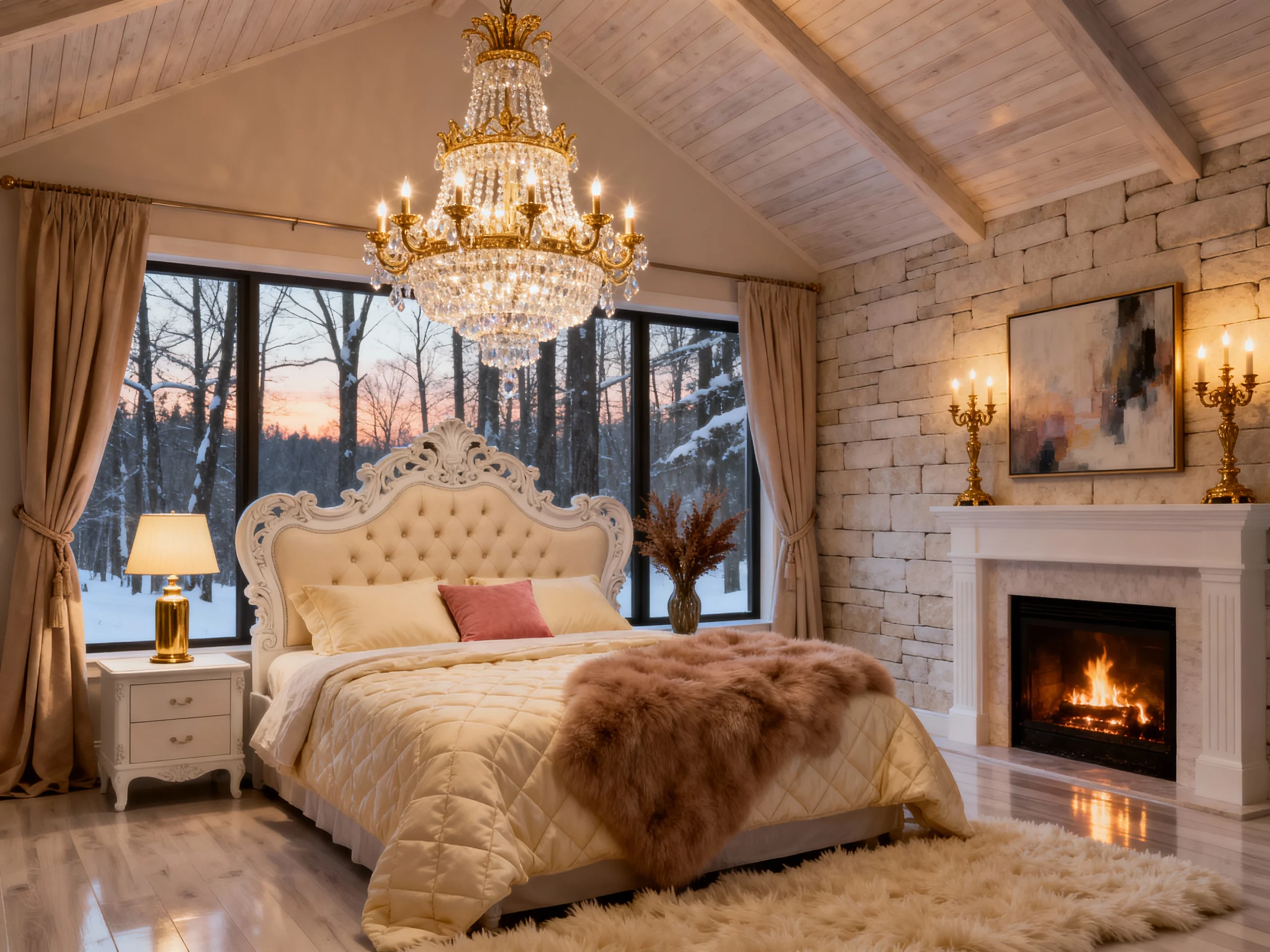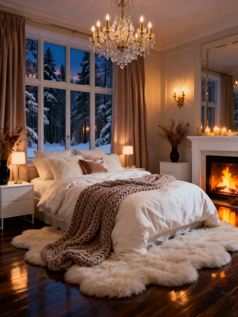 Can you imagine anything cozier than this? Picture yourself snuggled under that chunky knit throw with the snow falling outside that massive window. The gorgeous crystal chandelier adds a touch of glam, contrasting beautifully with the rustic, snowy view. And, hello, a fireplace right next to the bed? That’s the ultimate winter luxury. The layers of white and blush pink sheepskin rugs and bedding just scream “stay in bed all day!” This room is the perfect recipe for a warm, magical evening.