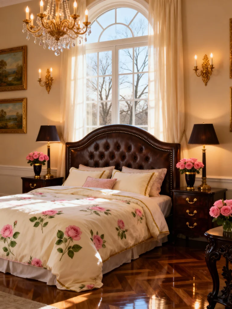 This room screams classic romance with a capital ‘R’! The arched window floods the space with beautiful, soft light. That gorgeous rose print duvet cover is instantly cheerful and charming. The contrast of the dark, rich mahogany leather headboard and bedside tables with the soft pink accents is stunning. Notice the double paintings and matching wall sconces—it gives the room a very formal, symmetrical, and traditional feel. It’s elegant, refined, and incredibly beautiful.