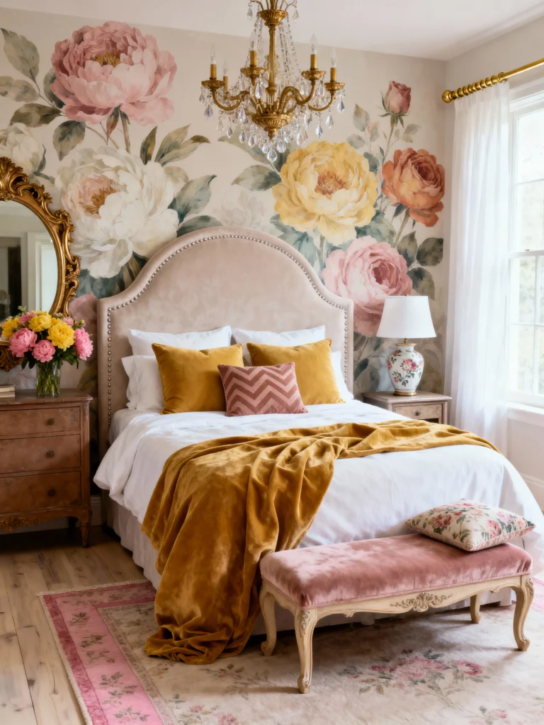 This is a statement! That wall mural of oversized, gorgeous peonies and roses is absolutely breathtaking. It turns the bedroom into a bright, cheerful, and romantic retreat. The gold mustard velvet throw and pillows pop so well against the white duvet, perfectly picking up the yellow and orange tones in the mural. The blush pink bench at the foot of the bed adds a lovely, soft touch. It’s vibrant, luxurious, and feels like perpetual spring.