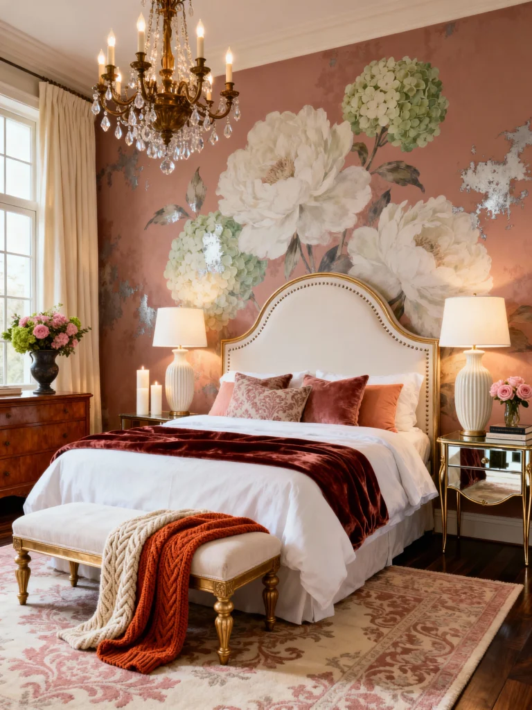 I am completely obsessed with that accent wall! The dusty rose color with the enormous white and pale green peonies and a subtle metallic silver texture is just divine. It creates a bold yet romantic backdrop. The rich, deep velvet throw and pillows in rust and blush tones add amazing depth and warmth. The mirrored nightstand and the gold trim on the bench bring in a touch of elegant sparkle. It’s a beautifully layered space that feels both cozy and luxurious.