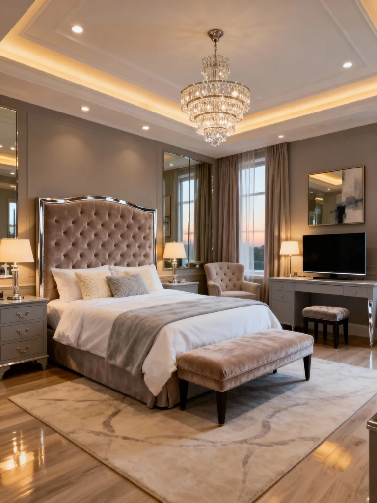 Welcome to a world of sophisticated neutrals! This room is all about taupes, grays, and soft lighting, creating an incredibly calming and polished atmosphere. The tall, tufted velvet headboard framed in chrome is ultra-modern luxury. I love the symmetry achieved with the matching nightstands, lamps, and oversized mirrors. The ambient lighting from the ceiling coves adds a soft, glamorous glow. It’s a masterclass in blending contemporary style with plush, high-end comfort.