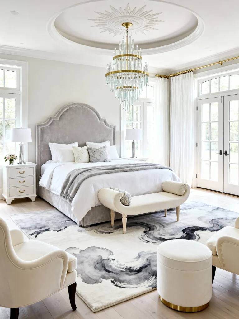 This is the perfect example of chic, modern serenity. The room is dominated by bright white walls and natural light, giving it an incredibly fresh and open feel. The gray velvet headboard and the white furniture keep the palette clean and airy. But the standout feature? That abstract, swirling gray and black rug! It anchors the room and adds a gorgeous artistic touch without cluttering the space. The sunburst ceiling medallion and cool-toned chandelier are the perfect, delicate finishing touches.