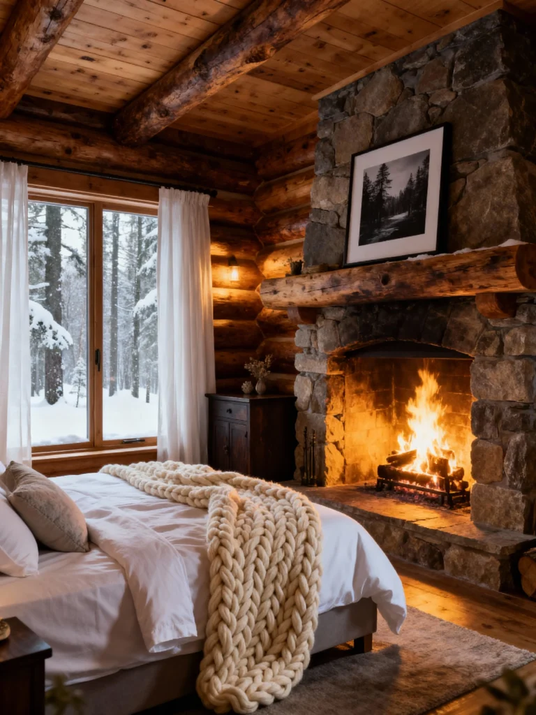 This room just screams “winter retreat.” Imagine coming in from a snowy walk and immediately sinking into this incredibly cozy bed. The massive, beautiful stone fireplace is the absolute star of the show, radiating warmth and that irresistible crackle. The chunky knit throw blanket draped over the pristine white duvet looks like the perfect weight for a long, deep sleep. I love how the log cabin walls and ceiling beams bring such a rustic texture, while the crisp white curtains keep the window bright and frame that lovely, snowy view. It’s the perfect blend of rugged cabin feel and soft, luxurious comfort—a true sanctuary for the colder months!