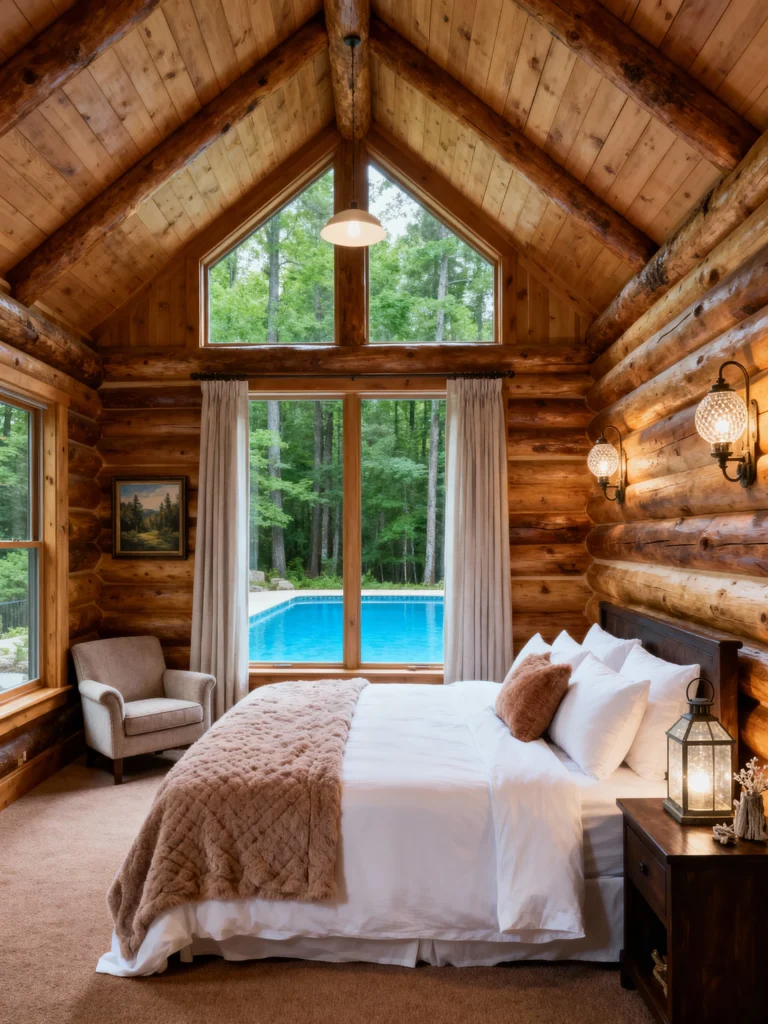 This room offers the ultimate unexpected luxury! You still get the beautiful log-cabin walls and the dramatic vaulted ceiling, but instead of snow or mountains, your view is a sparkling blue swimming pool surrounded by a lush forest. The room’s design is kept light and airy—the crisp white bedding and soft, natural curtains let the blue view and the light-filled architecture take center stage. The cozy armchair and the rustic-chic lanterns add an element of relaxed sophistication. This proves that a rustic escape can be enjoyed in any season and with any kind of view!