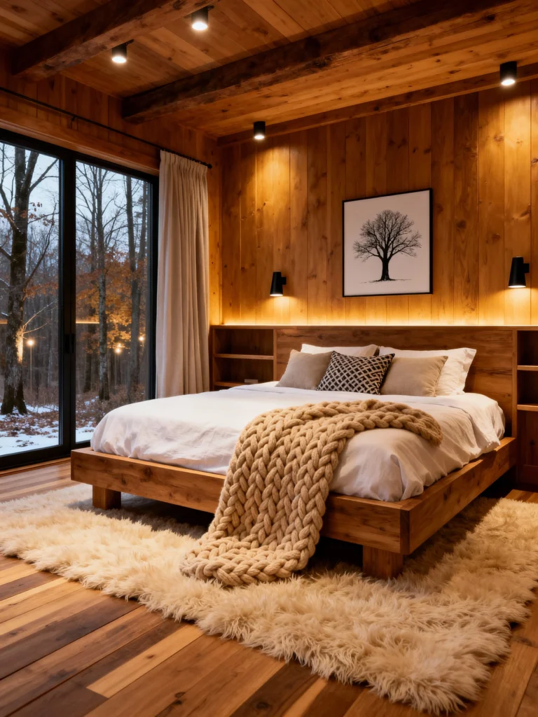 Okay, if the first room was classic cabin, this one is the sleek, modern cousin. It keeps the beautiful wood paneling but opts for a clean, streamlined aesthetic. The low-profile wooden bed frame and integrated shelving unit feel incredibly intentional and contemporary. Instead of a massive stone hearth, the focus is the huge sliding glass door that brings the snowy forest right into the room—that’s a stunning view! The lighting is also super modern, using recessed and stylish wall sconces. And let’s talk about the texture: the shaggy, cream-colored rug and that wonderfully oversized, chunky knit blanket on the bed add all the warmth you need against the dark winter backdrop.