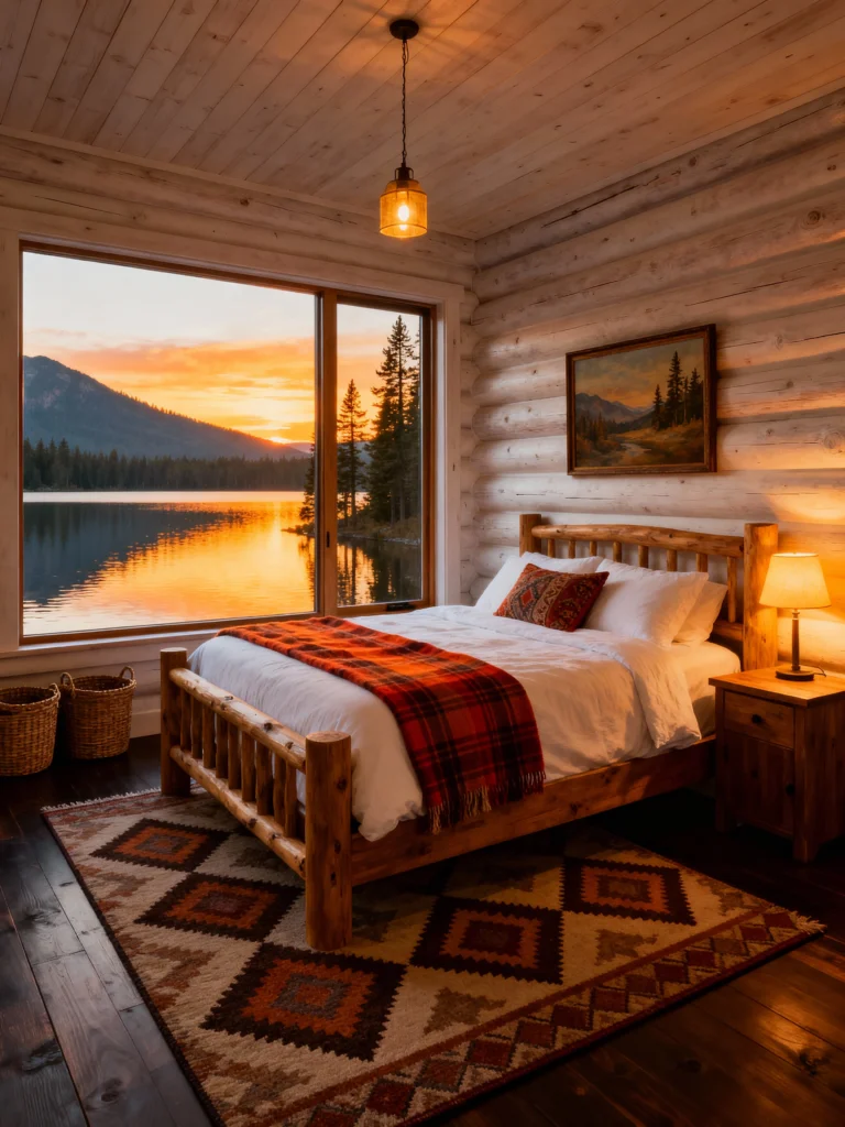 This room is all about that golden hour glow! The huge window perfectly frames a serene lake sunset—that orange and yellow light reflecting on the water and streaming into the room is breathtaking. The room itself is classic cabin, with natural log walls and a simple, sturdy wooden bed frame. I adore the cozy, dark-stained floors and the rich, patterned rug that ties in beautifully with the sunset colors. The pop of the red and orange plaid throw blanket on the bed adds that perfect touch of rustic charm and color, making this space feel intimate and incredibly romantic.