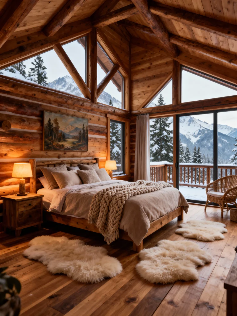 This is the ultimate mountain dream room! The architectural details—the massive windows that reach the ceiling and follow the roofline—perfectly frame those stunning, snow-capped peaks. It’s like sleeping inside a postcard. The décor is soft and natural, letting the view take center stage. The chunky knit throw and multiple sheepskin rugs scattered on the warm wooden floor bring incredible texture and softness. Everything is in a muted, earthy palette—creams, beiges, and natural wood tones—which perfectly complements the majestic, white and green landscape outside. This is where you go to wake up to absolute serenity.