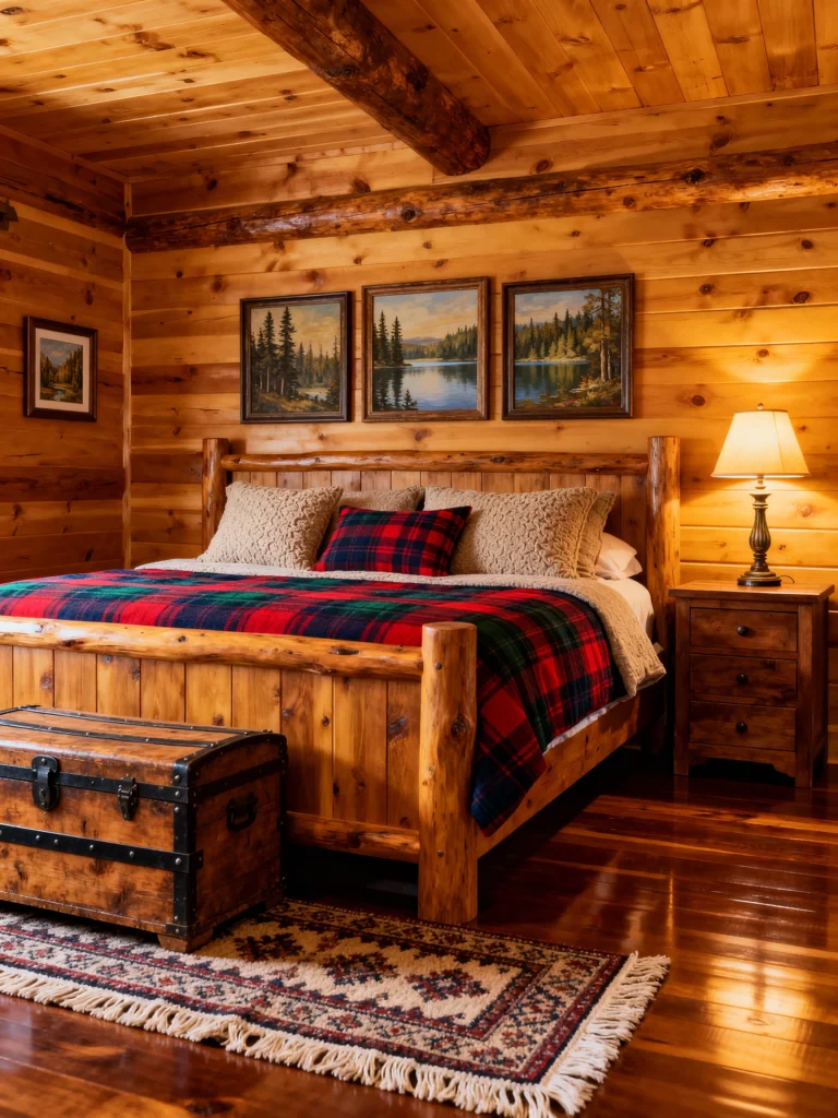 If you’re looking for that perfect, classic cabin feel, look no further. This room is a wonderful showcase of rich, natural wood—from the polished floor to the log-style bed frame and wall paneling. The focal point is definitely the traditional red, black, and green tartan plaid blanket, instantly adding that cozy, familiar camp vibe. I also love the rustic accent pieces: the old-fashioned trunk at the foot of the bed and the trio of landscape paintings above the headboard, beautifully reflecting the natural setting. It’s a warm, inviting room that feels deeply rooted in tradition and comfort.