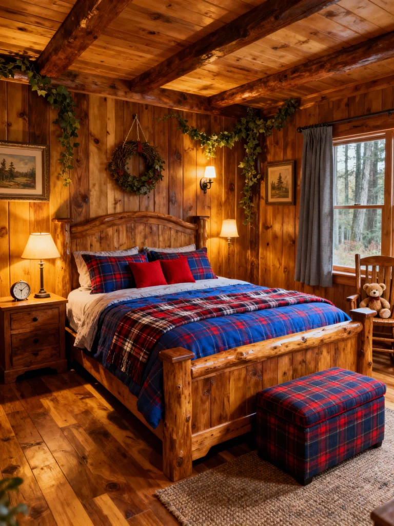 This charming room feels like a woodland hideaway, full of warmth and personality. The deep-stained wood paneling and log-style bed create a very intimate atmosphere. I love the accents here: the climbing green vines and the simple wreath on the wall add a playful, natural touch. The bedding uses a classic blue and red plaid, which pairs wonderfully with the rustic wood. Even the storage ottoman at the foot of the bed is upholstered in the same cozy plaid! The little rocking chair and teddy bear in the corner make this space feel incredibly welcoming and perfect for a cozy weekend retreat.