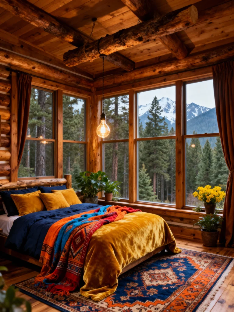 This room breaks away from the neutral palette with a stunning display of rich, saturated color. The deep navy duvet, paired with a throw blanket that explodes in bright yellow, orange, and blue, is an absolute showstopper. The jewel tones continue in the gorgeous, intricately patterned area rug. With huge windows framing a dense green forest and snow-dusted mountains, the colors inside create a beautiful contrast with the cool blues and greens outside. This is a bohemian-meets-cabin style that feels energetic, warm, and deeply personal.