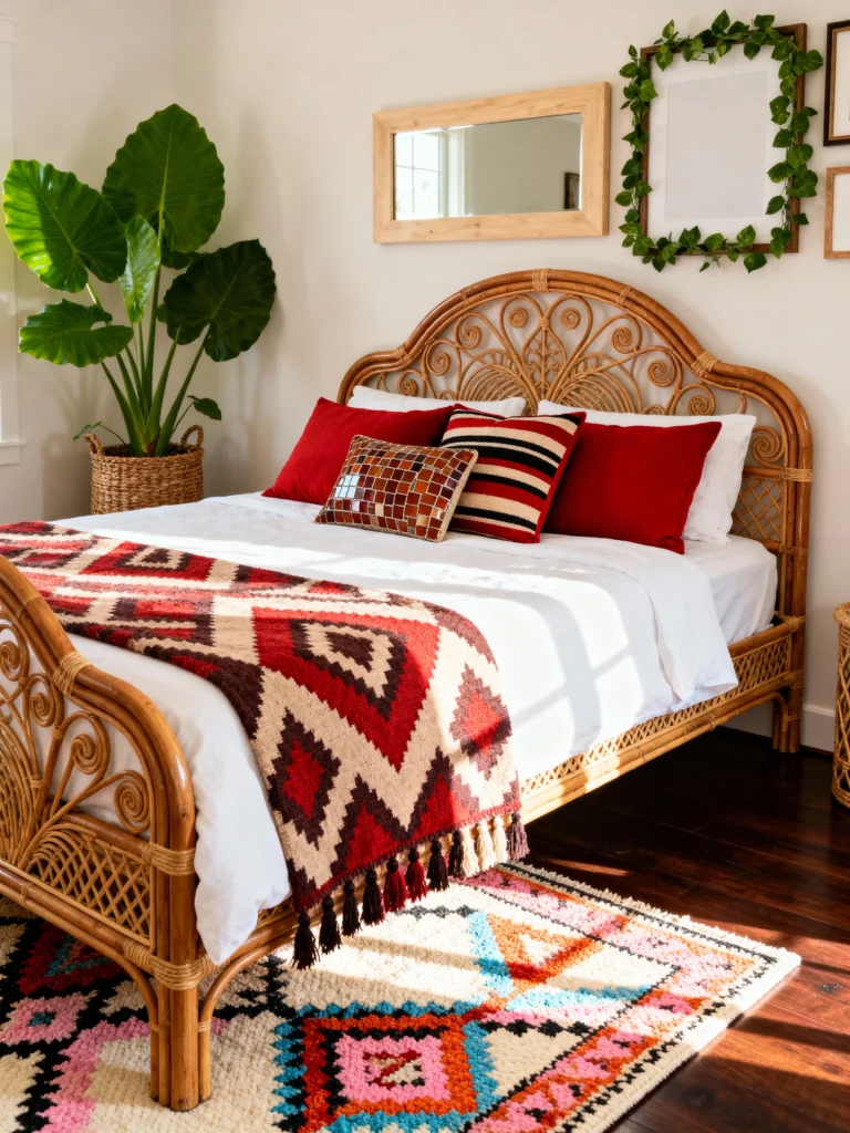 Okay, if the first image was calm, this one is a party! I am obsessed with how they dialed up the vibrancy here. The classic rattan headboard is the perfect frame for those bold red pillows and that incredible, patterned Southwest-inspired throw. And can we talk about that rug? It pulls in the deep reds and adds pops of bright color—it’s pure magic underfoot! Plus, the huge, leafy green plant in the corner brings life and a fresh, jungle feel. This look proves that you can absolutely do a boho vibe and still love rich, saturated color. Don’t be afraid to mix and match those patterns, but keep the bedding simple and white to let the colors shine!