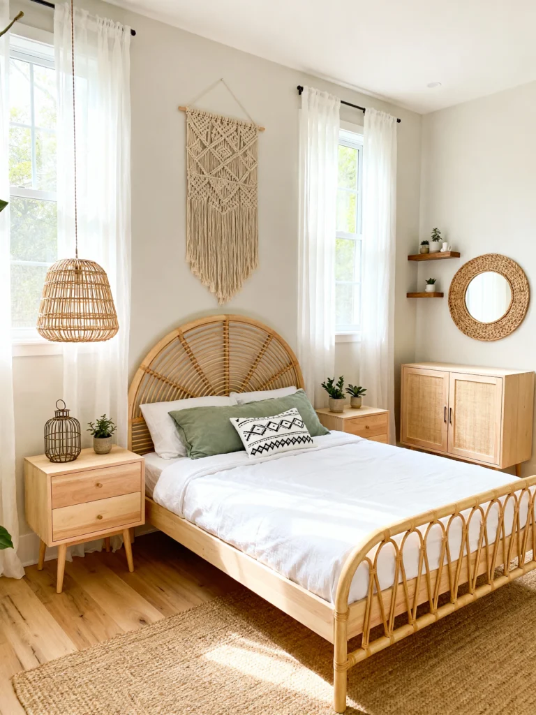 I can feel the sunshine just looking at this photo! This is boho perfection done with a touch of elegance. The delicate, rounded headboard and the woven cane on the footboard are simply stunning. The wall décor is genius: a large, textural sunburst medallion combined with smaller woven circles creates a cohesive, natural gallery wall. The warm neutral rug and the cream-and-tan bedding keep the focus on the beautiful light and the natural wood tones. It’s a serene space that still manages to feel incredibly rich in detail thanks to all those fantastic textures.