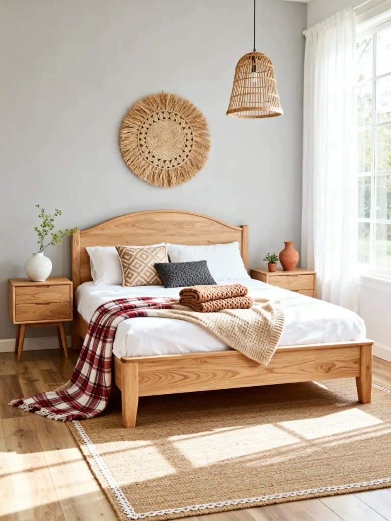 This is what happens when Scandinavian simplicity meets Bohemian texture—and it’s a match made in heaven! The clean, sleek lines of the natural wood bed and matching mid-century nightstands are very Scandi. But the boho heart comes out in the accessories! That large woven wall hanging adds instant global texture, and the layered rugs—a solid jute piece topped with a smaller, patterned rug—create warmth. The red and white plaid throw adds a cozy, cabin-like feel, proving that you can mix patterns and styles as long as you keep the main furniture pieces simple and unified.
