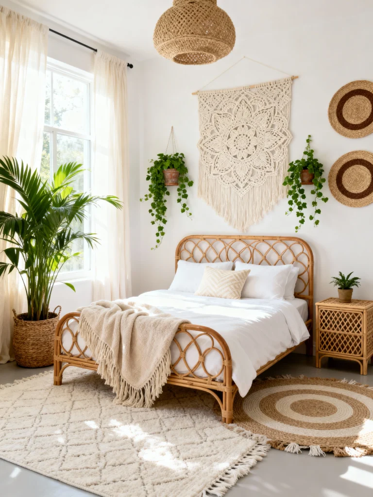 If you’re dreaming of a perpetual summer vacation, this is the room for you! The light rattan bed and the white bedding are classic, but it’s the textures on the wall that totally make this setup. The huge, intricate mandala macramé piece is such a statement, and I love how they flanked it with those simple straw hat-like wall hangings. Layering rugs—a fuzzy cream one over a round jute one—is a pro move to define the space and add softness. And the plants! Hanging vines and a tall potted palm complete the look, making it feel fresh, alive, and utterly tropical.