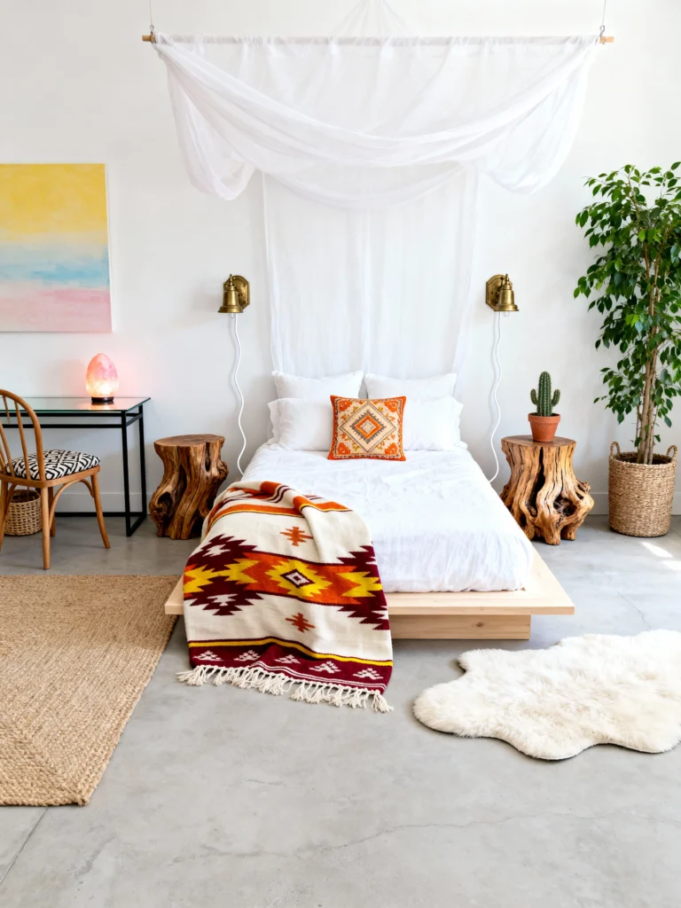 This space feels so clean, airy, and yet still super grounding. The low-profile, light wood platform bed gives it a distinctly modern feel. But the magic is in the accessories! They’ve swapped traditional nightstands for those rustic, chunky tree-stump tables—how cool is that? The sheer canopy draped over the bed adds instant romance and softness, contrasting beautifully with the bright white walls and polished concrete floor. Of course, the pop of color comes from that amazing geometric blanket thrown casually across the bed. It’s a perfect example of how to make minimalism cozy by adding natural wood and an eye-catching textile.