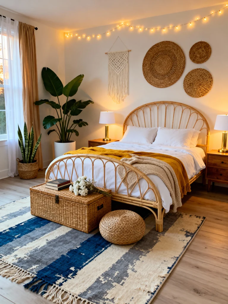 If you love a warm, moody glow, take notes from this space! The string lights draped across the wall are an instant mood-setter. The rattan bed is paired with a lovely mustard yellow throw, which creates a rich, welcoming palette. What truly makes this room stand out is the rug—that striking blue and white stripe is a beautiful contrast to the warm wood and neutral bedding. It proves that a great area rug can be the foundational piece of your design! Plus, storing blankets in that woven trunk at the foot of the bed is a functional and beautiful styling trick.