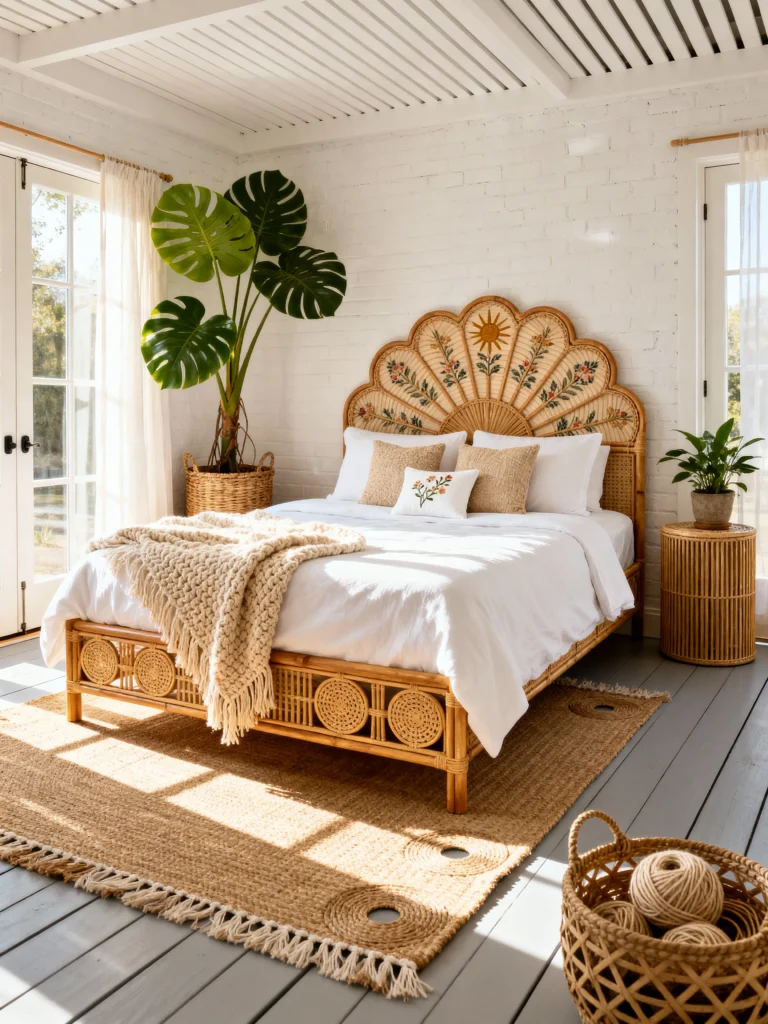This bedroom is an absolute showstopper! The natural light streaming in is divine, and the star of the show is clearly that incredible, hand-painted fan headboard. The sun and floral motif takes the rattan trend to a whole new level of artistry and personality. Paired with a simple, woven knit throw and a few coordinating pillows, the focus remains right where it should be. With the large monstera plant and the simple jute rug, the room has a relaxed, sun-drenched atmosphere. It’s a beautiful reminder that your bed frame can be a truly unique work of art!