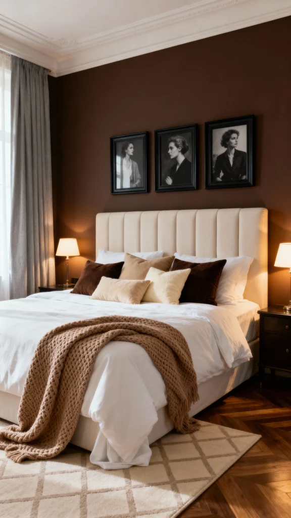Talk about sophisticated! The deep, rich cocoa brown walls (almost like a luxurious dark chocolate) provide the perfect, cozy backdrop for that gorgeous cream-colored upholstered bed. The crisp white linens are the ultimate contrast, making everything feel fresh yet warm. Layering brown, beige, and cream throw pillows, plus that chunky knit blanket, adds depth and irresistible texture. The framed black-and-white portraits and the simple brass lamps elevate this from cozy to totally chic.