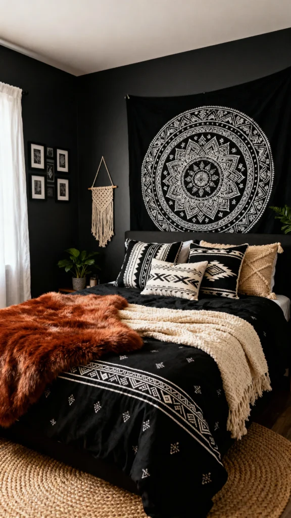 This room is a study in dramatic black and white with beautiful, earthy accents. The black walls and black bedding with white tribal patterns create a bold, graphic look. The star is the oversized white mandala tapestry, which adds a gorgeous bohemian focal point. The brilliant, shaggy burnt orange faux fur throw and the natural jute rug introduce that crucial warmth and softness. The macrame wall hanging and woven pillows complete the relaxed, cozy, and moody boho aesthetic.