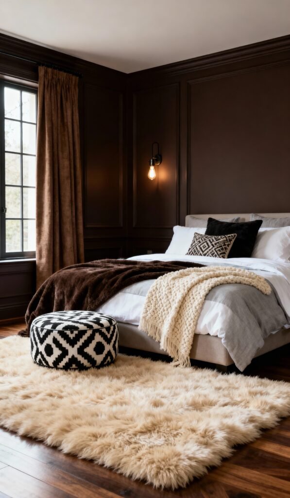 This room is a masterclass in textures and deep, woodsy browns. The paneled walls in that gorgeous dark hue create an instant feeling of intimacy and warmth. Notice the contrast of the sleek white bedding against the heavy, dark brown faux fur throw—pure luxury! The fluffy, cream-colored area rug and the patterned pouf add a delightful bohemian touch against the formality of the wall paneling. It’s a fantastic blend of rustic cozy and structured elegance.