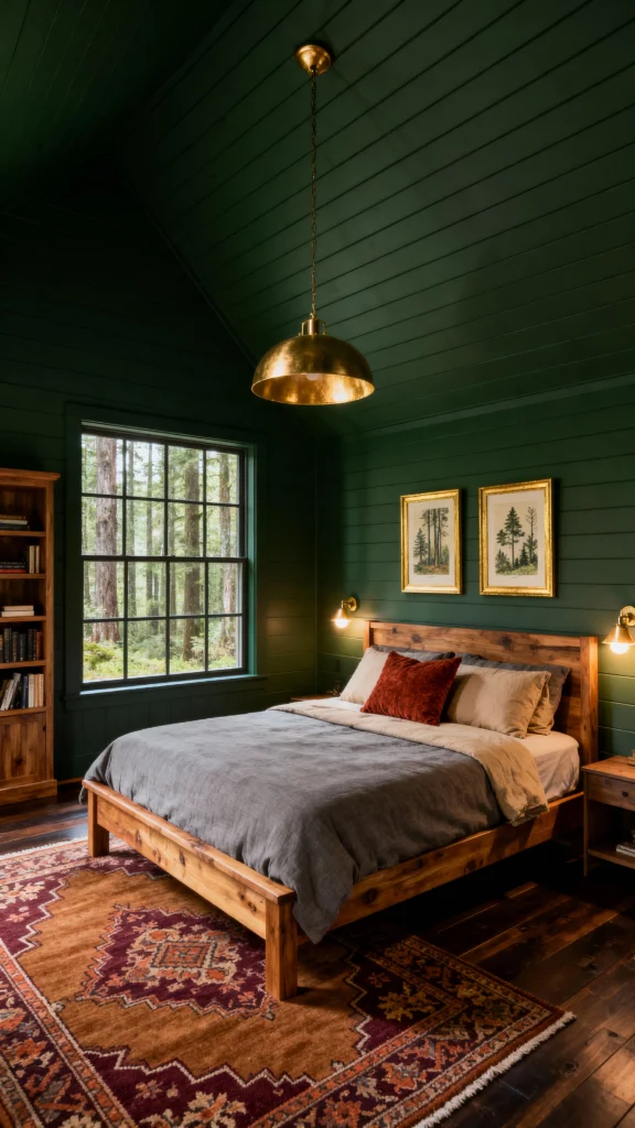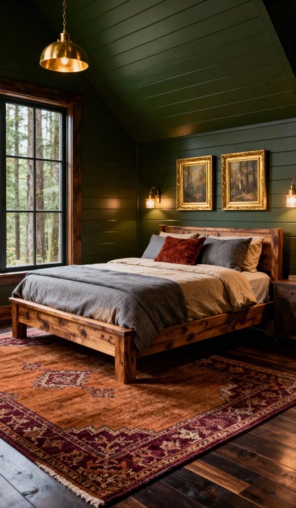 Similar to Image 3, this room dives even deeper into the forest theme with a darker, richer hunter green on the pitched shiplap ceiling and walls. The natural light wood bed and matching side tables maintain that wonderful cabin aesthetic. The bold, hammered brass pendant light is a dazzling focal point, adding a touch of golden warmth. Once again, the earthy tones in the rug and the rust-colored pillow prevent the dark walls from feeling cold, keeping the atmosphere supremely cozy.