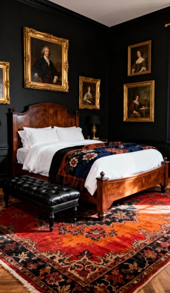 Wow, this bedroom is pure, unapologetic drama! The black walls and detailed paneling are a sophisticated canvas for the stunning traditional wooden bed. What really catches the eye is the use of rich color and pattern: those beautiful gold-framed classical portraits and the incredible Persian-style rug in vibrant red and orange. The glossy black leather bench at the foot of the bed adds a modern, luxurious edge. It’s moody, opulent, and feels like stepping into a private, historic chamber.