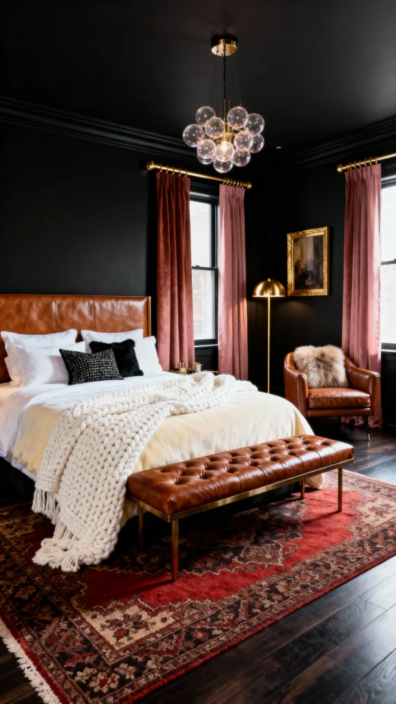 This design proves that dark walls can still be incredibly vibrant! The matte black walls are softened by the rich, dusty rose velvet curtains, which add a feminine touch. The caramel leather upholstered headboard and matching tufted bench bring a powerful, modern warmth. I love the contrast of the bright white bedding and the chunky white knit blanket. The modern bubble chandelier and brass accents—like the floor lamp—introduce a touch of unexpected, airy glamour to the dark space.
