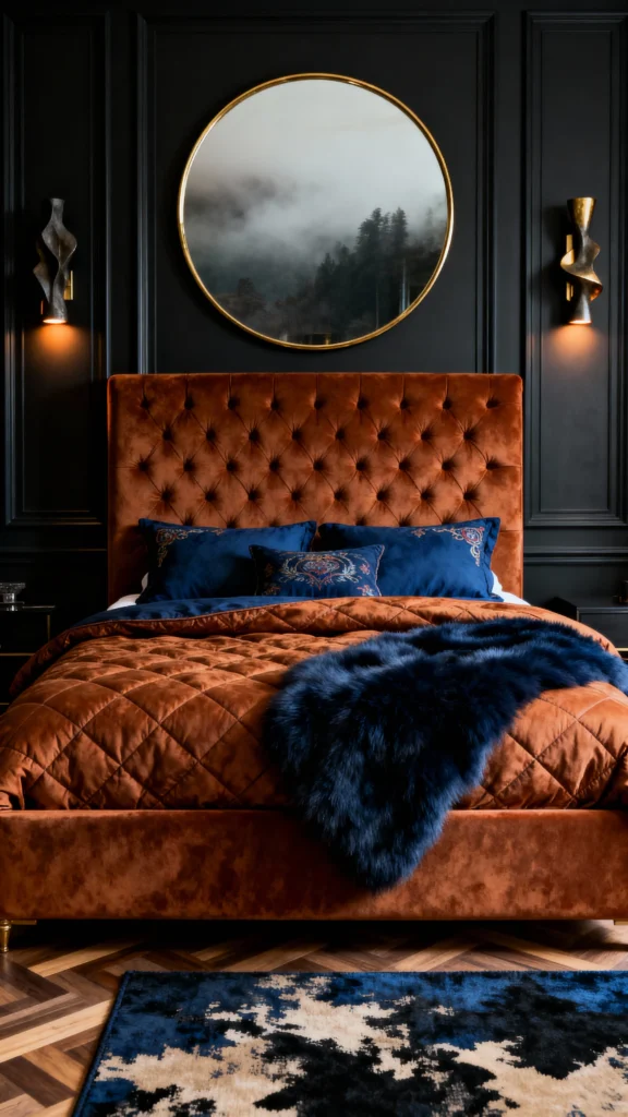 This room screams luxury! The incredible burnt orange velvet tufted headboard is the centerpiece, radiating warmth against the deep black paneled walls. The bedding perfectly matches the headboard for a cohesive, rich look. But the navy blue accents—the throw, the pillows, and the abstract rug—are what make this truly spectacular. Navy and burnt orange is an unexpected and deeply satisfying color combination. The large, gold-rimmed circular mirror is the perfect piece of statement art.