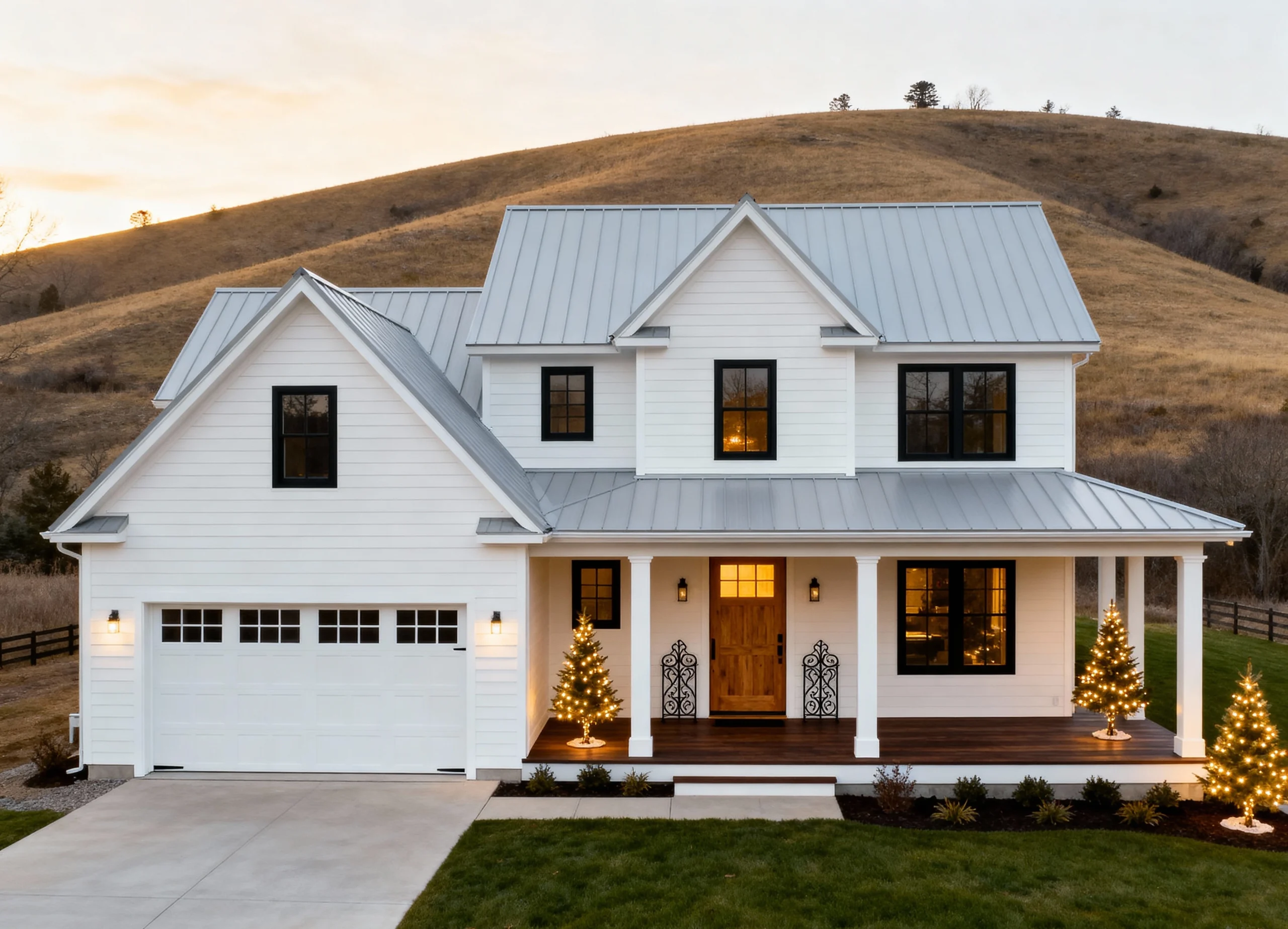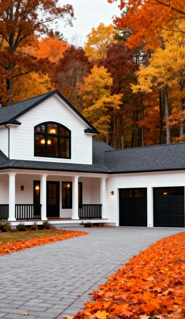 If this doesn’t scream cozy fall vibes, I don’t know what does! The combination of the classic white farmhouse-style home with black accents and the vibrant autumn foliage is breathtaking. The grey paver driveway is covered in a scattered blanket of rich orange and yellow leaves, leading right up to the inviting front porch and black garage doors. It’s a perfect snapshot of seasonal beauty and classic American architecture.