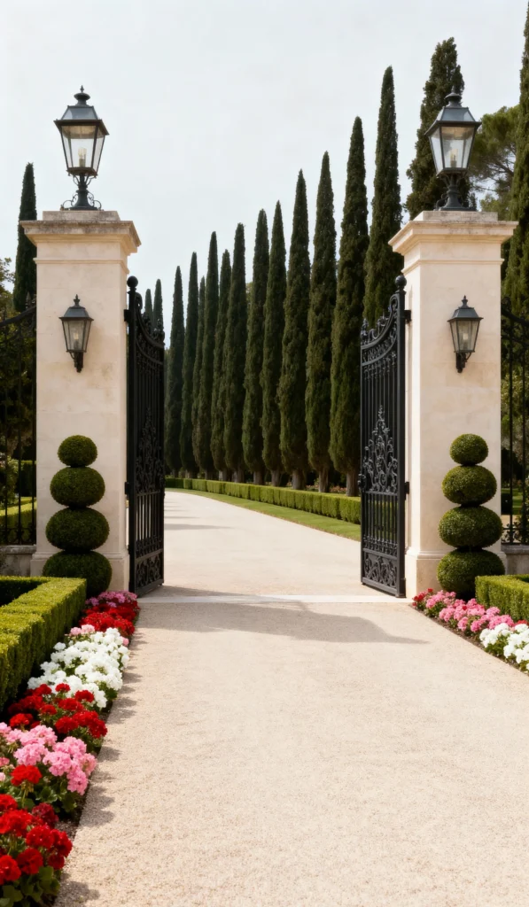 Now this is a grand entrance! The tall, stately stone pillars with elegant lanterns frame a set of imposing black wrought-iron gates. Beyond them, a long, light gravel driveway stretches away, lined on both sides by a dramatic row of tall, slender cypress trees. The formal landscaping, with boxwood hedges and colorful red, white, and pink flowers, enhances the estate’s sophisticated and manicured look. This entrance certainly makes a statement!