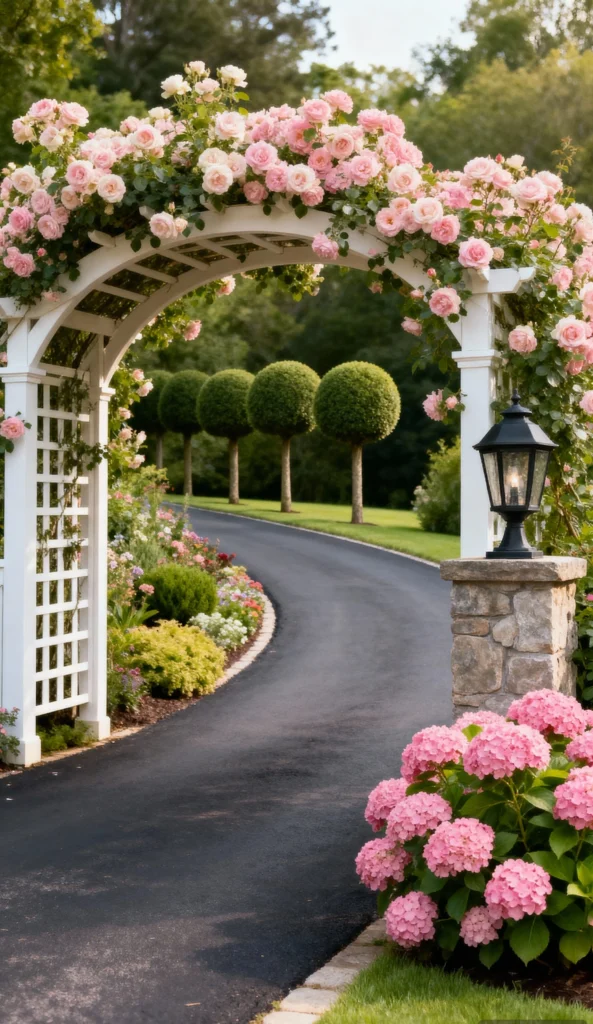 Could anything be more enchanting than this entrance? Imagine walking through this beautiful white arbor dripping with soft pink climbing roses! The paved driveway curves gently into the background, flanked by perfectly manicured green trees. On the right, the stone pillar with a lantern and the vibrant pink hydrangeas add even more texture and color. This is the definition of a welcoming, storybook garden entryway. It sets such a romantic and elegant tone for the whole property!