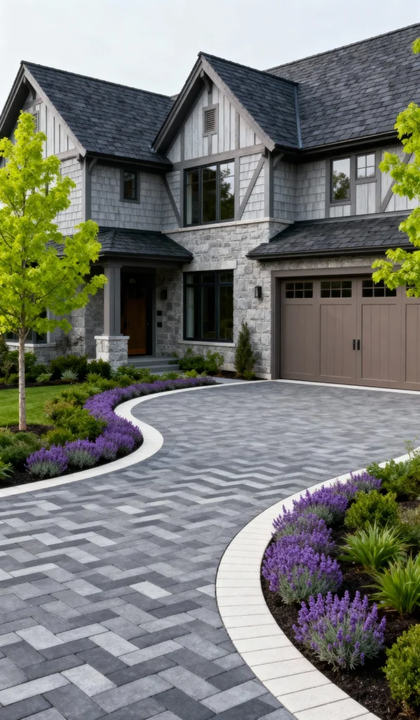 The driveway is laid with rectangular pavers in a sharp, eye-catching herringbone pattern using varying shades of grey. The clean, white curved border clearly defines the edge of the driveway, contrasting beautifully with the rich purple of the lavender plantings. This landscaping is just lovely—the vibrant colors soften the hardscape beautifully, guiding you right up to the charming grey stone and shingle home.