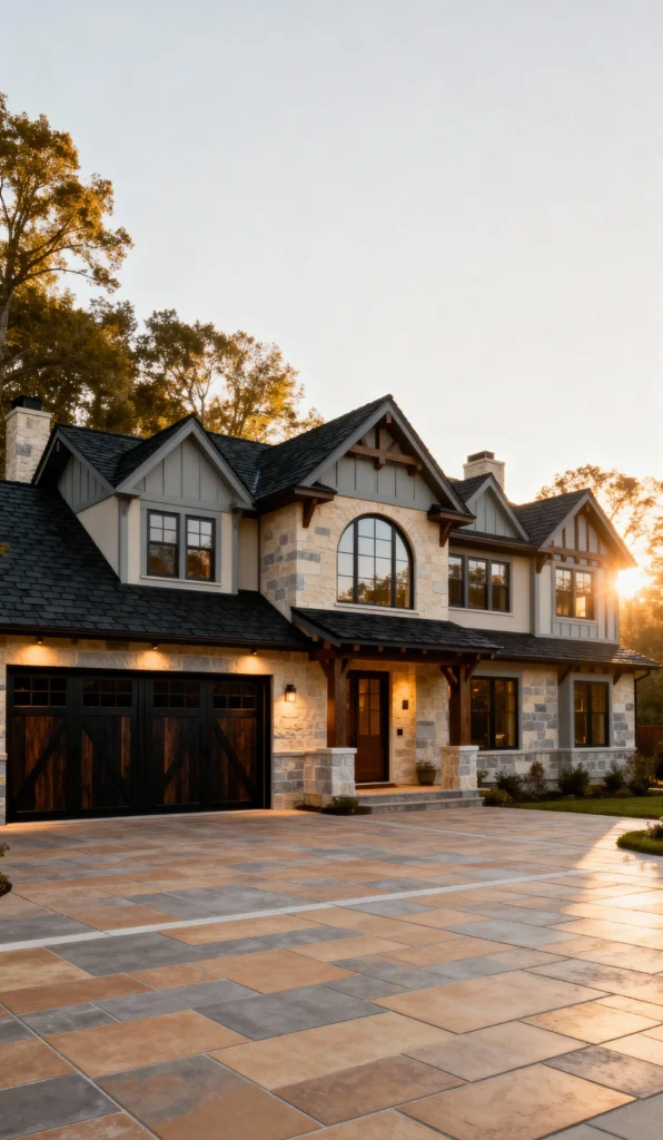 This home is absolutely stunning, and the multi-toned paved driveway perfectly complements its architecture. The pavers feature a mix of warm terracotta, beige, and slate tones, really catching the beautiful golden light of the sunset. The house itself features stone and siding elements, with rustic timber accents above the entrance and garage doors. It has a beautiful, upscale Craftsman feel, and the expansive, richly colored driveway adds so much warmth and visual depth.