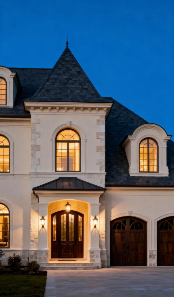 This home looks like it was plucked right out of the French countryside! The architecture is incredibly elegant, with its stately roof, arched windows, and light stucco facade contrasted by rugged stone accents. The wooden double door entryway is inviting, and the paired carriage-style lanterns beautifully frame the entrance. Even the dark wood garage doors complement the grand, sophisticated feel of the home. It’s all about luxurious symmetry and timeless design here.
